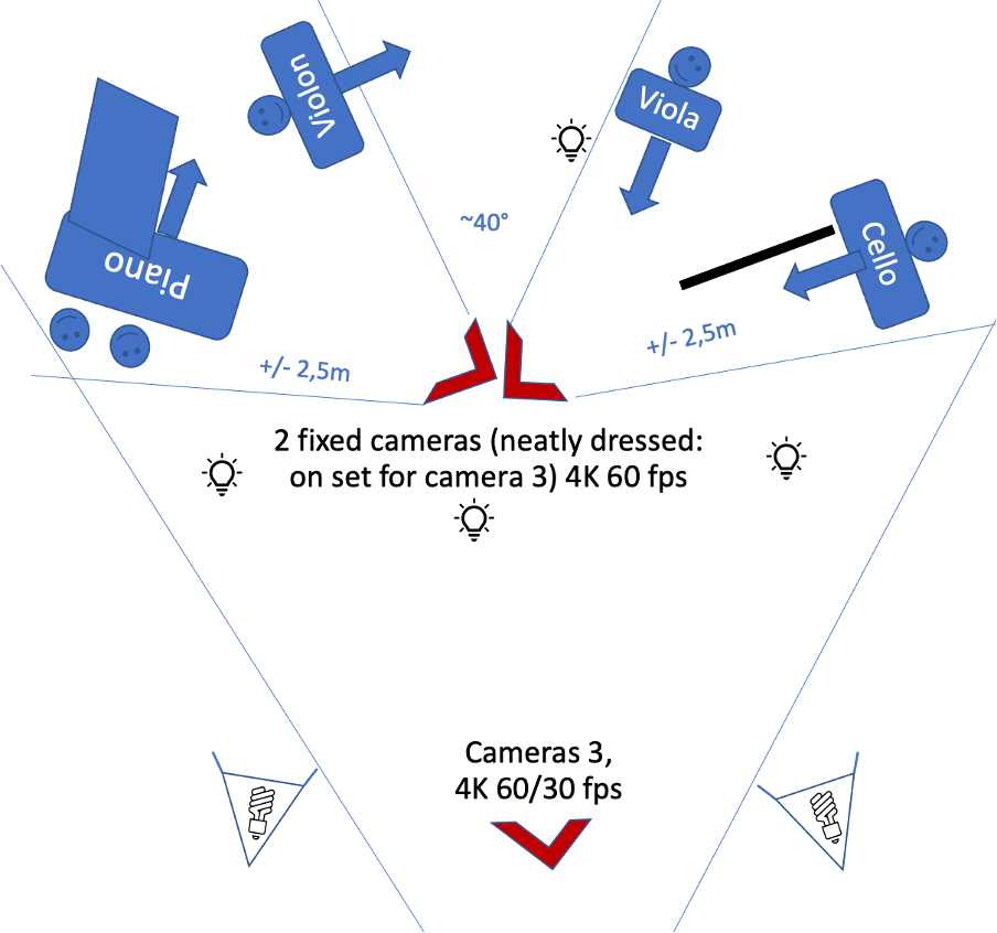 A professional sound engineer did all the sound mixing (see credits). We adapted all the stereo sound images to the camera angles. We didn’t use any new next-generation audio technology, just plain vanilla stereo. To keep it low-tech and straightforward, the only effect used in postproduction was panning, i.e., controlling each audio input’s left/right mix. So, when an instrument is on one side of the image, you hear it from that side. We refrained from adapting the volume on any track or changing any equalisers (there is only a simple one to enhance the cello).