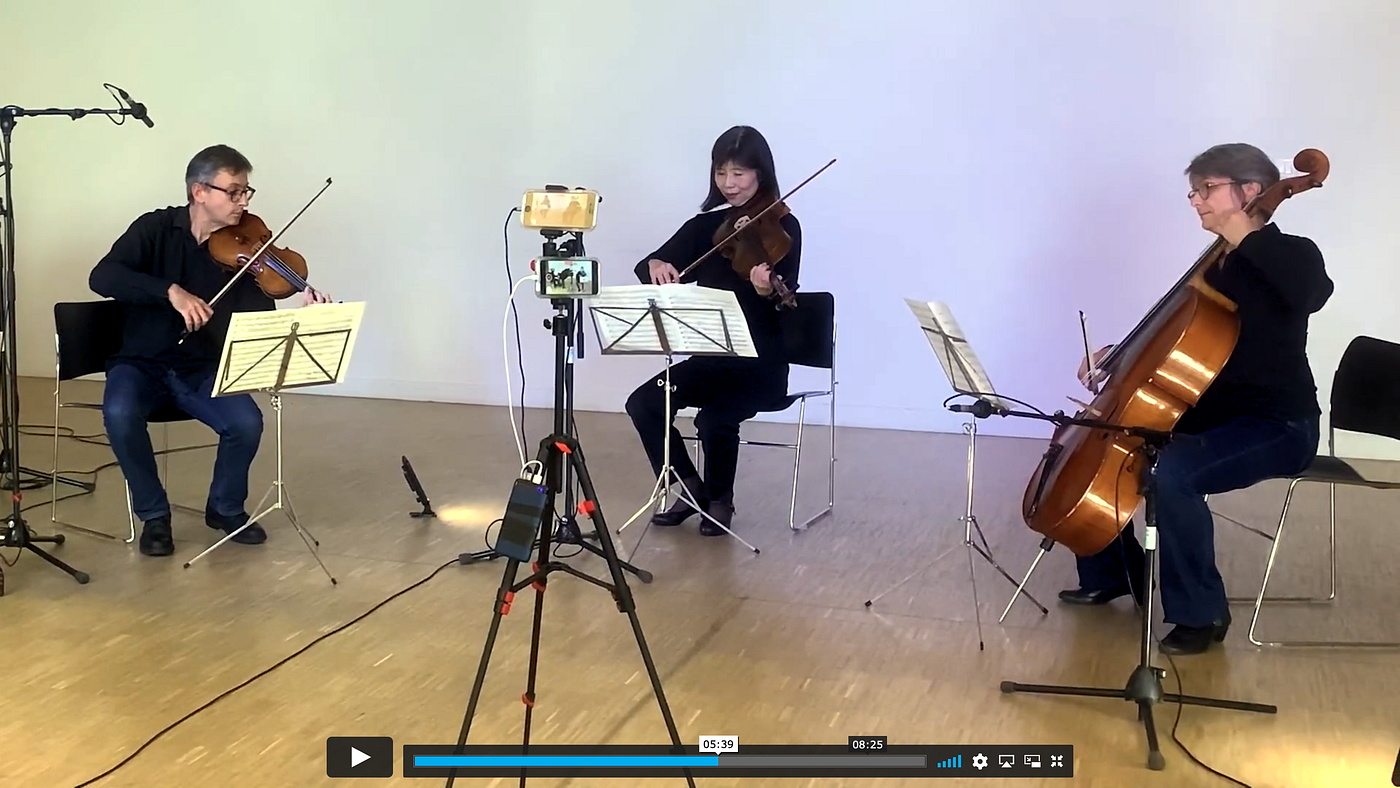 The three stereo recordings below are of Mozart’s piano quartet K478 (1st movement). All video is identical. The first two have sound images dynamically adapted to the video image. The first has a moderate adaptation, and the second has more significant changes to the audio field so that you hear instruments in the same part of the audio field as the video. The third recording is a regular fixed stereo sound provided for reference. Please wear headphones or listen with real stereo speakers well positioned to the screen’s side. We suggest listening in the following order: